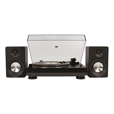 Keep the music coming with the K100 two-speed, belt driven turntable stereo system. The balanced s-shaped tonearm offers hydraulic lift control, a ...